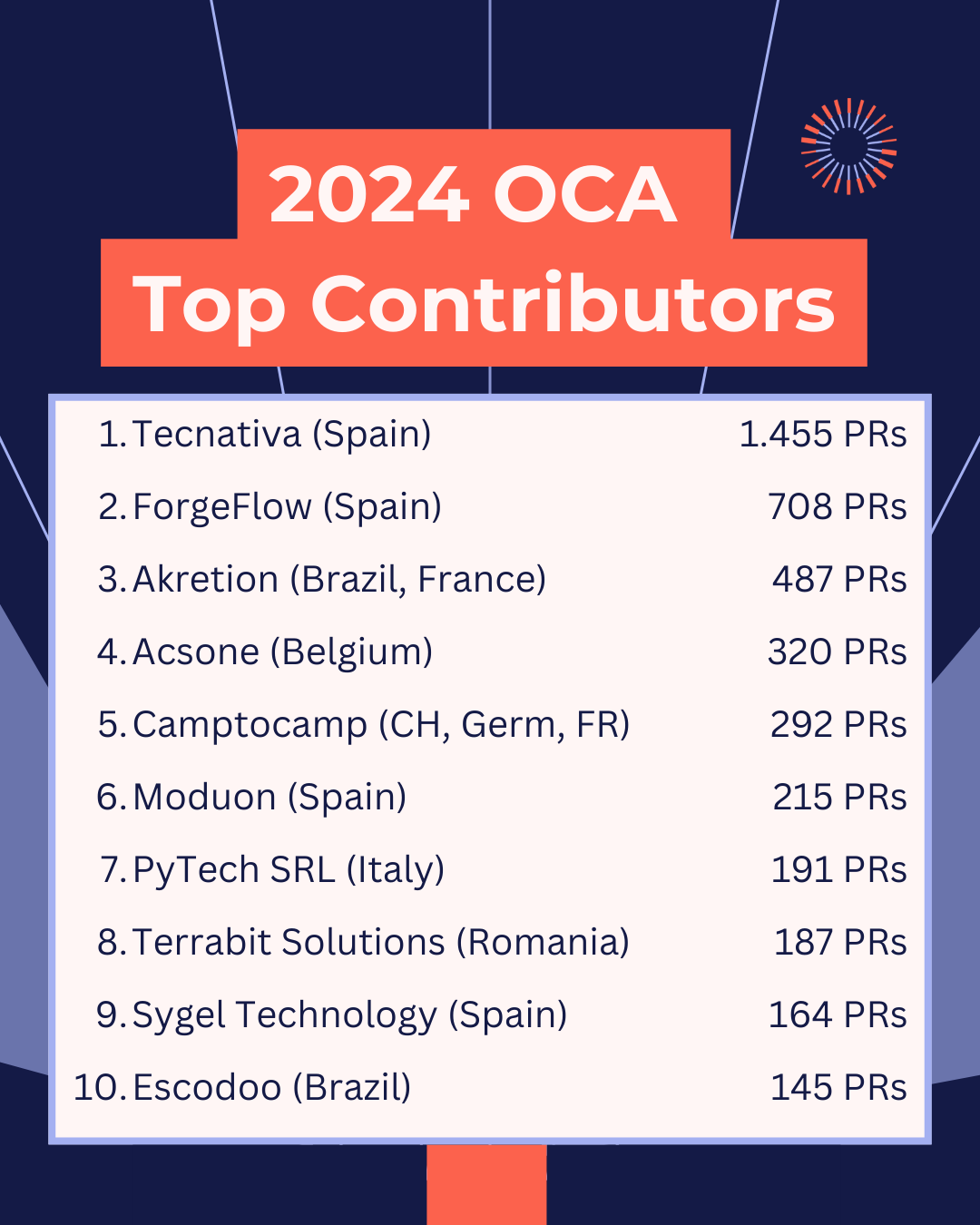 The strength of open-source projects lies in their communities, and the Odoo Community Association (OCA) is no exception. Over the years, OCA has grown into a vibrant ecosystem of developers, contributors, and users working together to improve Odoo for everyone. Today, we want to take a moment to celebrate the incredible individuals who contributed to OCA by submitting Pull Requests (PRs) during 2024.