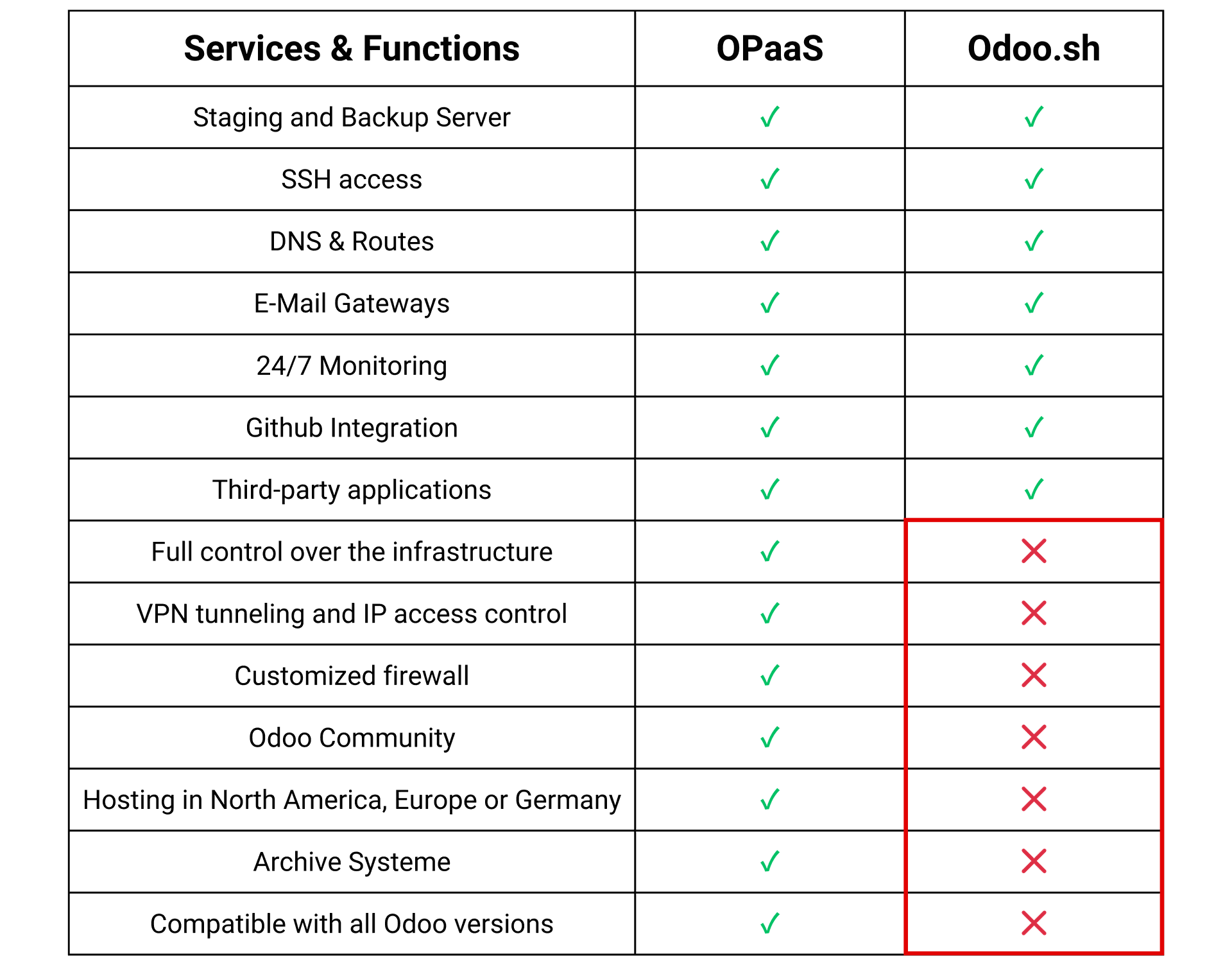 OPaaS is a powerful Odoo cloud hosting solution that revolutionizes the Odoo hosting offer on the market. The limitations of Odoo.sh are overcome by additional features.