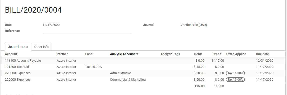 Hello Juan José,Excellent, this is exactly what I was looking for. Many thanks!Do you accept that we propose this module to OCA?The name of the module should be changed though, as the name account_analytic_distribution is already used for another module.It could be changed to something like account_analytic_distribution_move_linesThanks,GuillaumeOn Tue, 17 Nov 2020 at 17:01, Juan José Scarafía (ADHOC) <scarafia.juanjose@gmail.com> wrote:Hi Guillaume,We have the same needs and think similar to you.Before the existence of analytic tags (and analytic tags distributions) we have this module "account_analytic_distribution" that works this way:* on an invoice you choose the "distribution analytic account" on each line (it is a normal analytic account with distribution lines as the new analytic tags of odoo)* when validating the invoice, the account.move was created but account.move.line where splitted if you're using analytic distributionThat way, the distribution works for analytic and accounting reports.We haven't migrated or found an approach for v13+ yet. On v13, with the removal of account.invoice, I was thinking in something similar but perhaps more "manual" on the invoice, a button to split lines, but you won't have a way to go back to the distribution.On Tue, Nov 17, 2020 at 9:57 AM Vandamme, Guillaume <guillaume.vandamme@acsone.eu> wrote:Hello everyone,I'm currently facing an issue with the analytic distribution functionality of Odoo. I would like to share it with you as some may have faced the same issue recently and may be able to help. I'm working on Odoo V12, but the same situation occurs on different versions as well.When checking the 'Analytic Distribution' box on an analytic tag, this analytic tag can be used to allocate a certain percentage of an expense or an income on several analytic accounts.Example: On the picture below, the 'Analytic distribution key 1' analytic tag will allocate 50% of the expense/income on the 'Administrative' analytic account and the remaining 50% on the 'Commercial & Marketing' analytic account.When validating a simple vendor bill of 100 euros with this 'Analytic distribution key 1' selected, Odoo is generating a journal entry with three journal items: payable account, tax account and an expense account (100 euros) which is linked to the 'Analytic distribution key 1' analytic tag. My two analytic accounts (Administrative + Commercial & Marketing) don't appear here.Besides that, Odoo is also generating two analytic items in the 'Accounting --> Analytic items' menu to divide the total amount of the expense (100 euros) according to the distribution key (50% for both analytic accounts). These analytic lines can also be found in the 'Analytic Lines tab' on the expense journal item.My problem is that this breakdown on both analytic accounts doesn't appear in the journal items/entries, it only appears in the analytic items. This makes reporting based on journal items much more complicated (ex: Mis Report to generate a P&L by analytic account).I would rather prefer that the breakdown on both analytic accounts applies directly on the journal entry. Hence, instead of having one expense journal item (100 euros) related to the analytic tag, we would have two expense journal items (50 euros each),both related to their analytic account (Administrative or Commercial&Marketing). This would probably make things much easier.Any thoughts on this?Does this 'problem' sound familiar for some of you? Has anyone ever found a solution for this?Thank you very much for your help,Regards,Guillaume Vandamme--Guillaume Vandamme