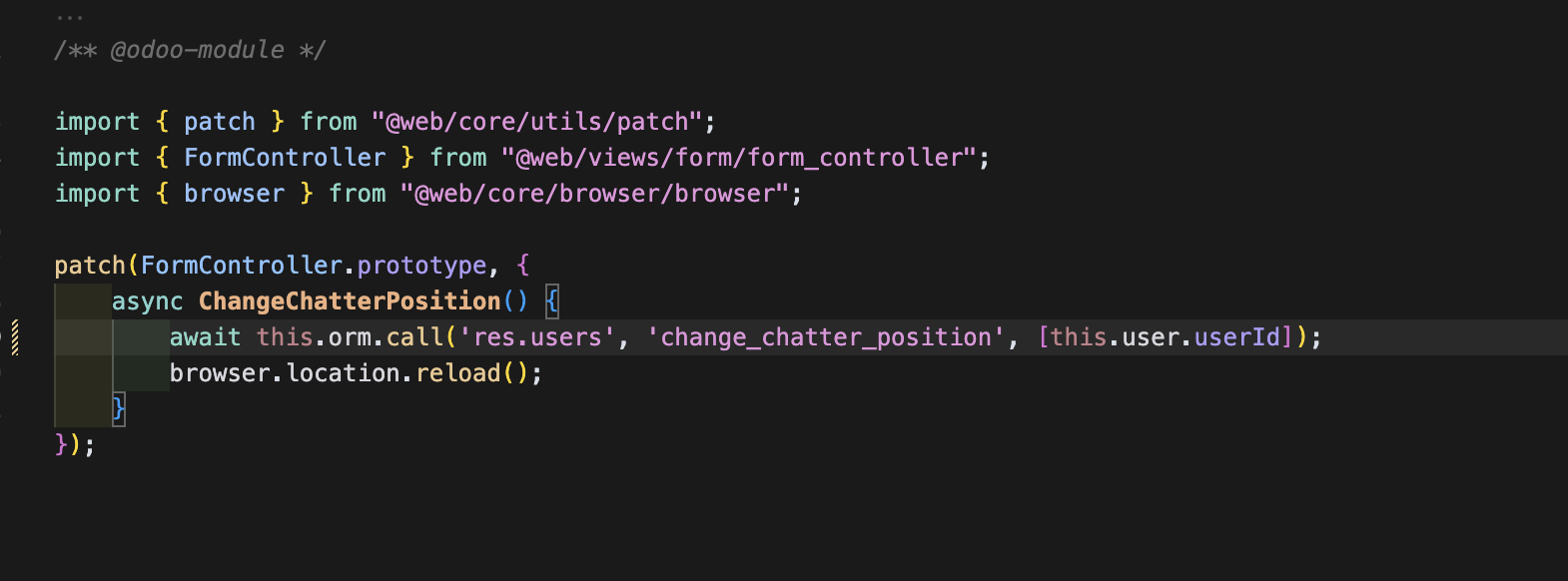 While working on an Odoo 17 project, I inherited the web_chatter_position module to add a button on form views that allows users to change the position of the chatter (either at the side or at the bottom of the form).